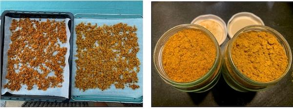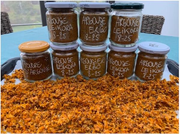 De pulp en pitten die uit de extractor komen, worden uitgespreid om te drogen, hetzij in een veranda, hetzij in een voedseldroger. Eenmaal volledig droog wordt alles zeer fijn vermalen tot een typisch oranjebruin poeder, licht verschillend per variëteit. Dit poeder wordt gebruikt als kruid: in het ontbijt, op kip of eieren, of in een salade.