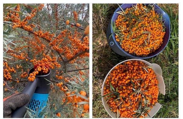 De oogst van duindoorn begint met een Gardena-bessenplukker. Dit hulpmiddel, met fijne tanden voor kleine twijgen en bredere tanden voor dikkere takken, maakt snel werken mogelijk. De bessen raken soms licht beschadigd, maar aangezien de verwerking meteen volgt, is dat geen probleem. Het rendement is uitstekend: ongeveer drie kilo bessen per uur in het begin, later gestabiliseerd rond twee kilo. Daartegenover staat dat deze methode meer plantaardig afval (blaadjes, kleine twijgen) oplevert, en dat een aantal bessen op de grond valt of openbarst.